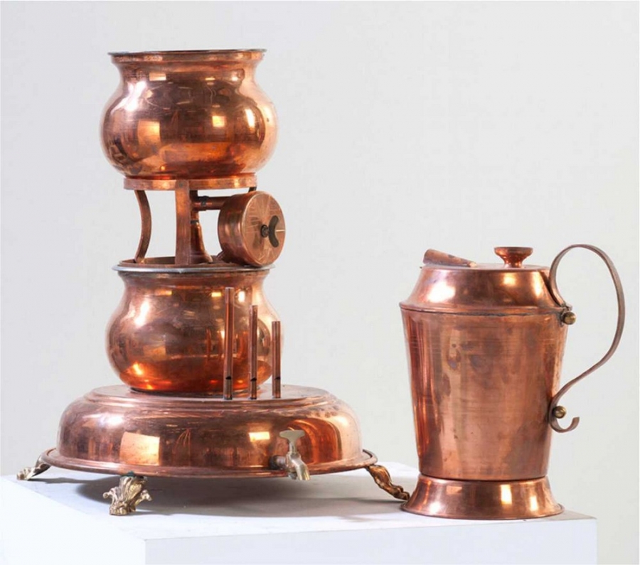 Τα δοχεία και η βάση είναι χάλκινα, εξελασμένα στον τόρνο.